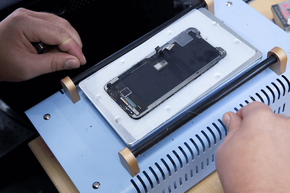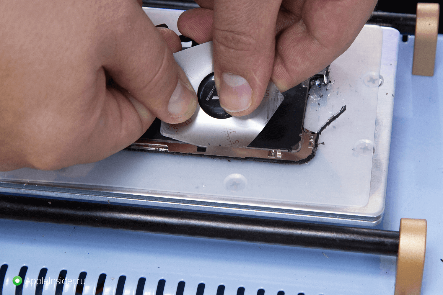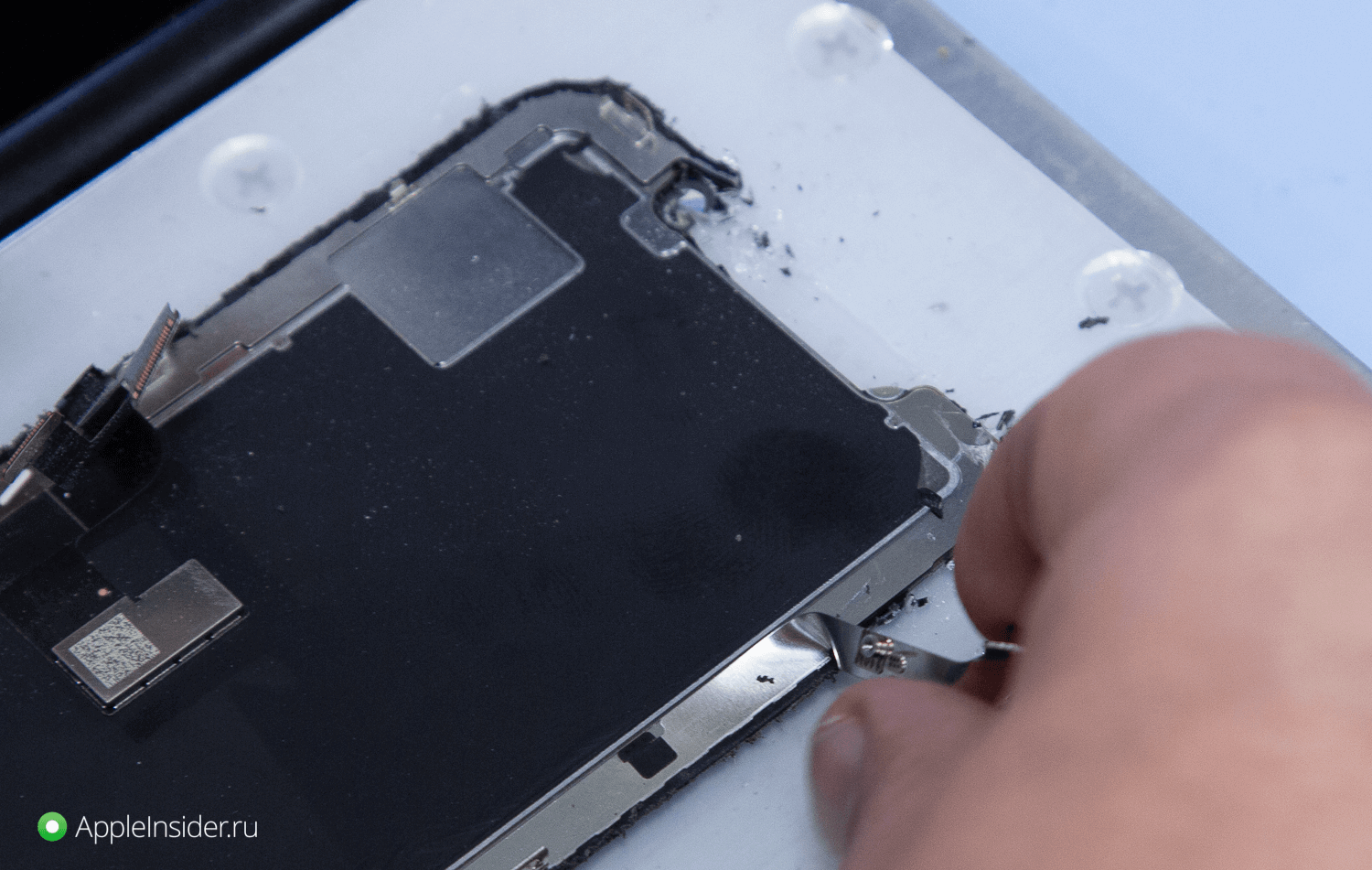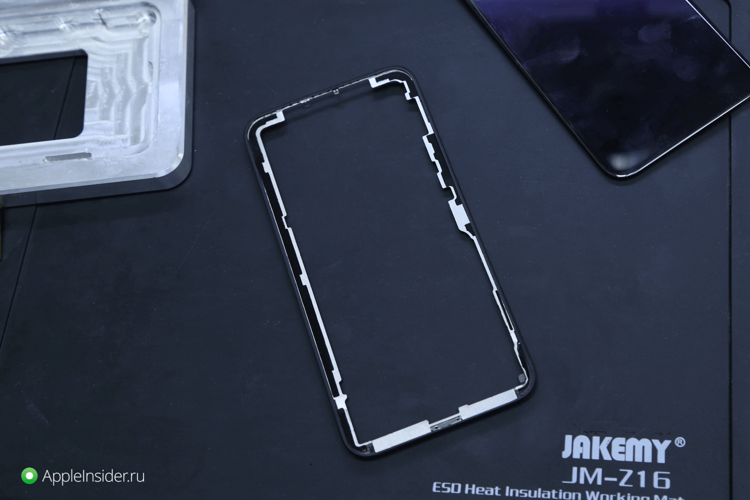 При помощи инструментов он демонтирует старую рамку дисплея и старое стекло.