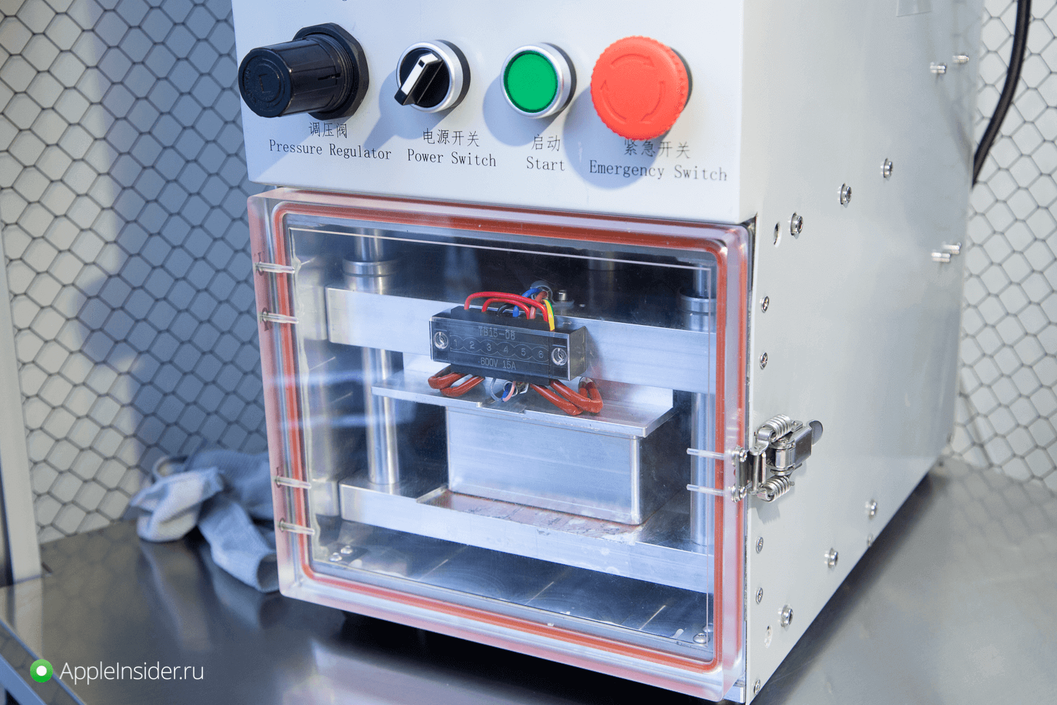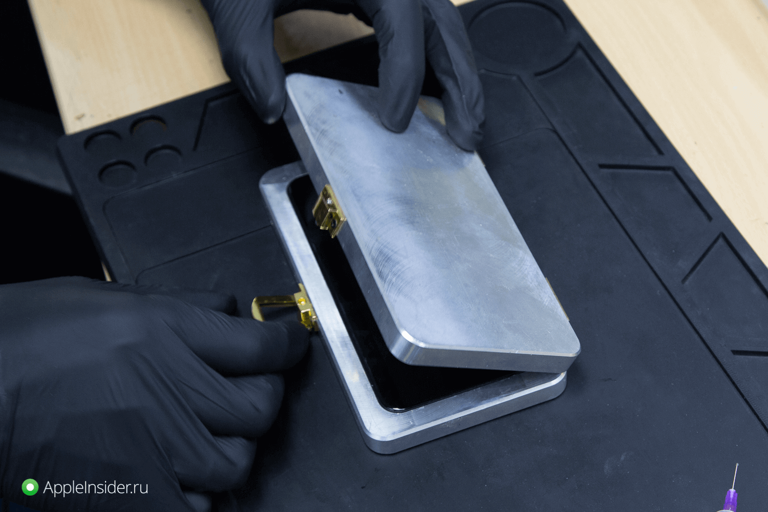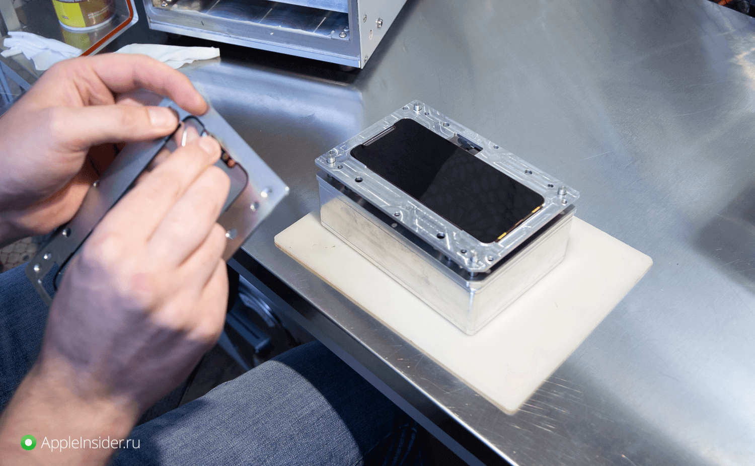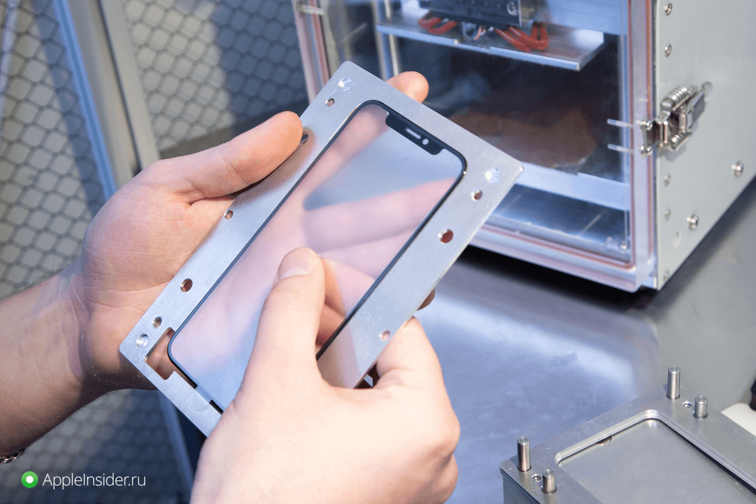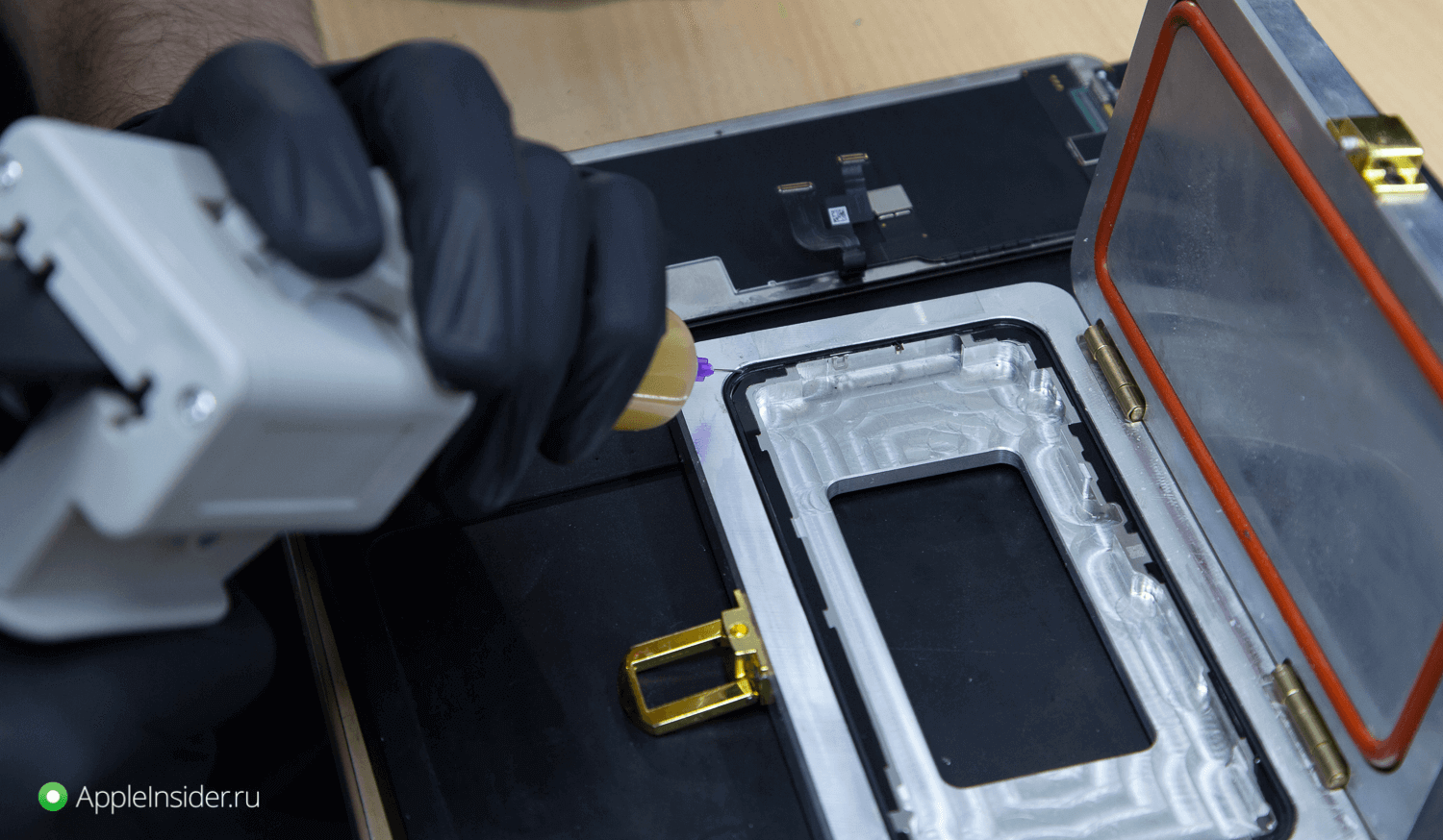 В специальной беспылевой комнате инженер зачищает дисплейный модуль и подготавливается новое стекло. К последнему приклеивается OCA-пленка, после чего осуществляется склейка дисплейного модуля и стекла.