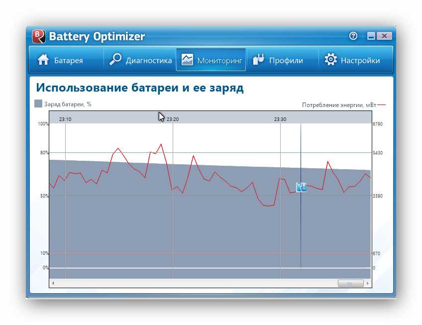 На следующей вкладке «Мониторинг» можно просматривать степень разрядки аккумулятора и оценивать моменты потребления энергии. Состояние аккумулятора ноутбука представлено в виде удобного графика.