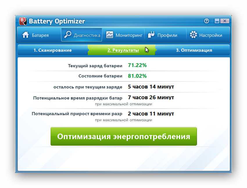 Не пользуясь ноутбуком, дождитесь завершения операции мониторинга. В результате вы увидите данные о состоянии аккумулятора и времени его работы при разных вариантах оптимизации с предложением об оптимизации.