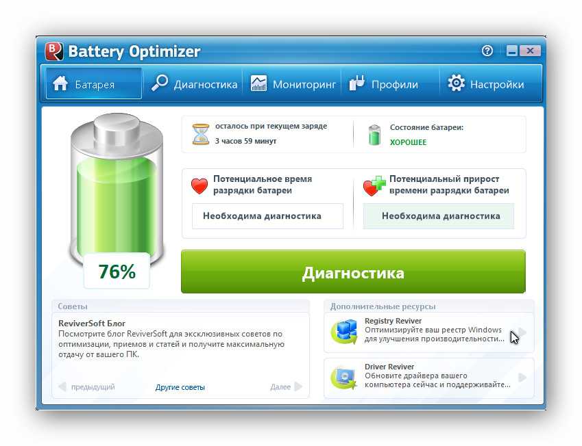 Вторая вкладка «Диагностика». Здесь можно запустить мониторинг аккумулятора ноутбука и получить результаты для анализа и дальнейшей оптимизации.