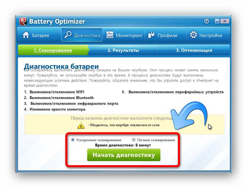 Есть поверхностный и глубокий режимы диагностики. Глубокий — более точный, но долгий. Во время диагностики рекомендуется не пользоваться ноутбуком. При этом программа может отключать и включать устройства компьютера (wi-fi, bluetuth, внешние устройства) и менять яркость дисплея. И, конечно же, ноутбук должен не заряжаться во время диагностики, то есть быть отключённым от зарядного устройства.