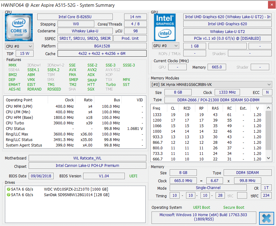 Процессор Intel Core i5-8265U примечателен тем, что это, если можно так сказать, усовершенствованная версия Intel Core i5-8250U. Он уже относится к семейству Whiskey Lake и по сравнению с предшественником имеет немного увеличенные частоты и улучшенный 14 нм техпроцесс.