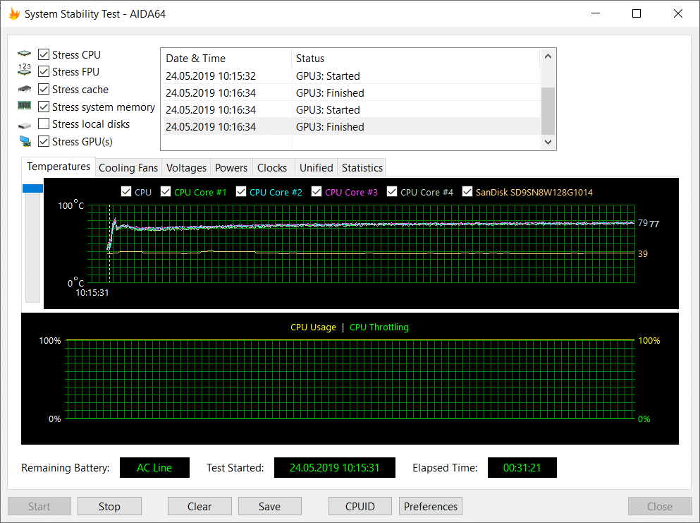 Результаты тестирования показывают, что в одноядерном режиме Turbo Boost процессор 10210U периодически выходит на частоту 4.2 ГГц, хотя большую часть времени работает на частоте 3.9 ГГц. Когда ноутбук работает от батареи, максимальная частота процессора в одноядерном режиме составляет 1.8 ГГц.