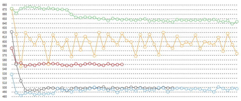 Обратите внимание: в многоядерном тесте первое место занимает Dell Inspiron 5585 с достаточно стабильными результатами в диапазоне от 650 до 670 баллов.