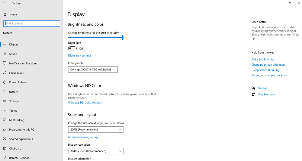 Все конфигурации ноутбука ConceptD 7 оснащены одинаковой матовой 15,6-дюймовой 4K-панелью IPS от AU Optronics. Возможно, для кого-то жаль, что это так, ведь возможное снижение до разрешения Full HD позволило бы выпустить гораздо более дешевые варианты устройства. С другой стороны, речь идет об устройстве, которое изготовлено для людей творческих, поэтому оно должно отличаться своей бескомпромиссностью. С этой точки зрения наличие дисплея 4K в любой доступной конфигурации вполне оправданно.