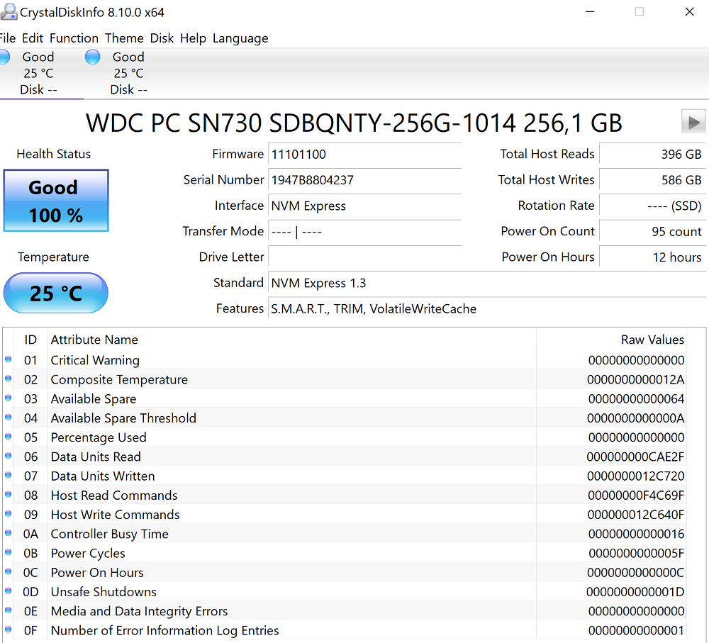 С другой стороны, мы должны обсудить в этой теме еще одно хорошее решение. Упомянутые 512 ГБ дискового пространства состоят из двух твердотельных накопителей от Western Digital M.2 PCIe NVMe WD PC SN730 SDBQNTY-256GB-1014, объединенных в матрицу RAID 0 Volume.