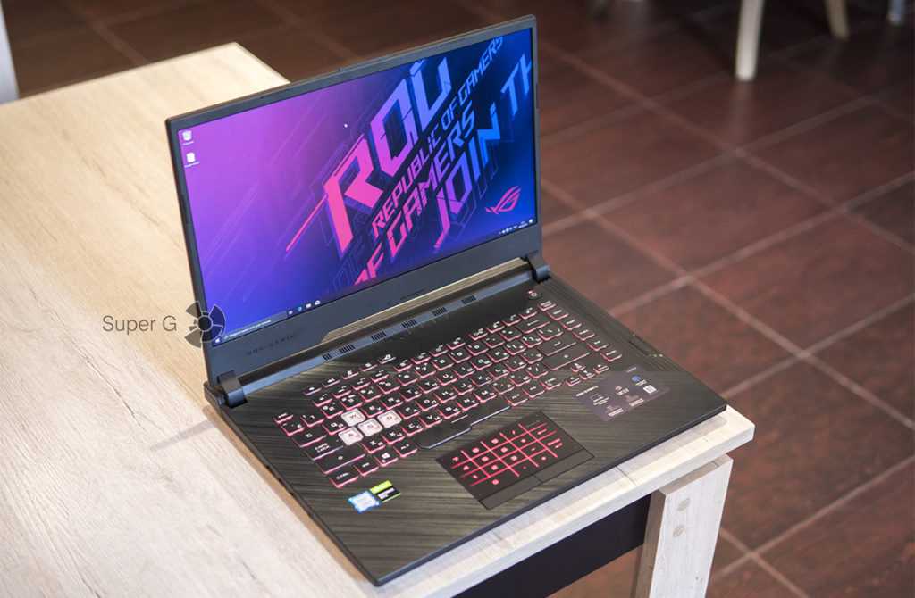 Самый дешевый — не значит некрасивый. ASUS создавали свой ROG Strix G в сотрудничестве с дизайнерами BMW, поэтому ноутбук получился стильным и по-настоящему игровым. Черный матовый корпус сочетается с большим количеством разноцветной RGB-подстветки: на клавиатуре и по всему периметру. У меня на руках тестовый инженерный образец, так что последняя не работает.
