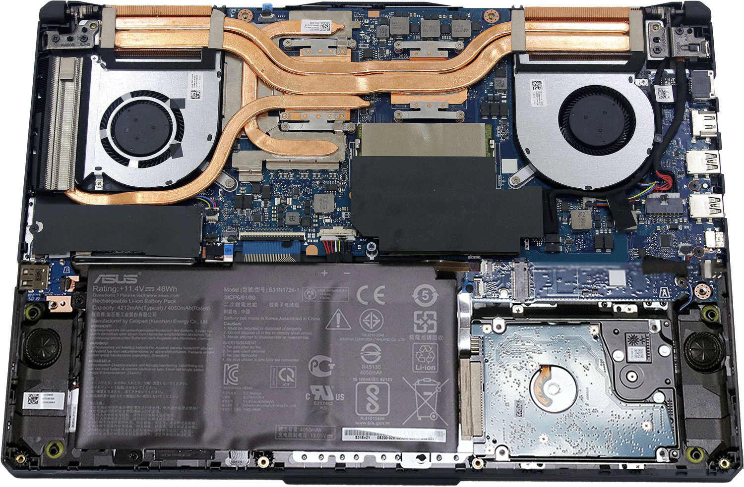 Нижняя крышка крепится к основному блоку винтами и защелками. Компоновка внутри корпуса достаточно плотная и свободное место практически отсутствует. Данный ноутбук поддерживает апгрейд, поэтому можно добавить еще одну планку ОЗУ стандарта DDR4, или заменить накопители SSD M.2 и обычный 2,5 дюймовый HDD.