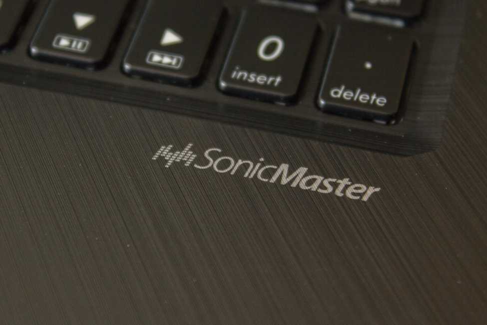 Далее видим немного утопленный в корпус блок клавиатуры с 99 клавишами, небольшой тачпад, в правом верхнем углу которого находится площадка сканера отпечатков пальцев. Правее под клавиатурой — надпись SonicMaster.