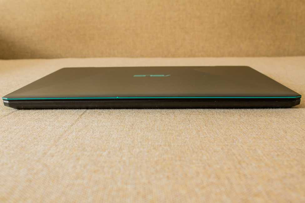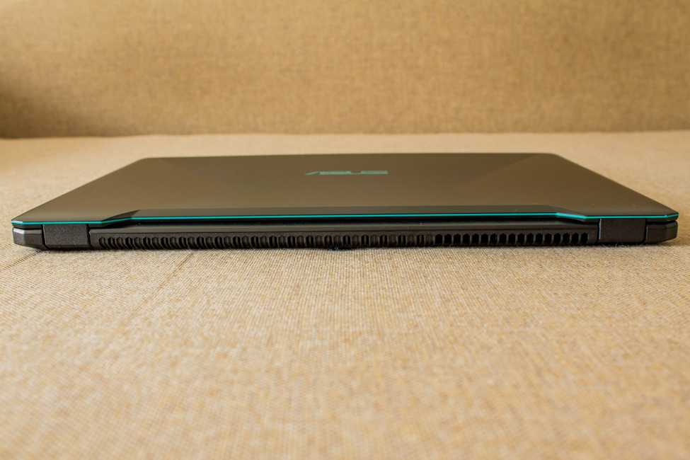 Внешне, если убрать «украшения», ноутбук выглядит как классическая модель с привычными формами. На задней части есть большая вентиляционная решетка. В задней части крышки есть привычный вырез, но уже без индикаторов активности. Видимо, эта фишка все же для более дорогих ноутов, а у ASUS FX570U индикаторы можно увидеть только подняв крышку ноутбука.