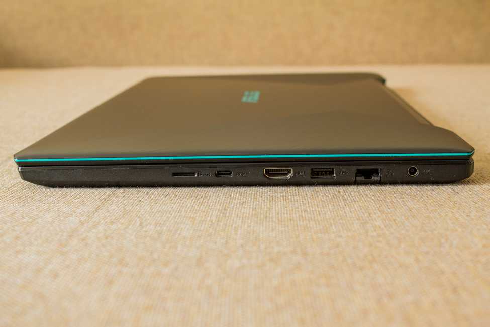 На левой грани я нашел два разъема USB, комбинированный аудиоразъем и никому не нужный замок кенсингтон. На правой (по порядку) разъем питания, RJ-45, USB, HDMI, USB Type-C и кард-ридел для MicroSD. Вот тут, честно говоря, есть претензия. Заключается она в том, что в столь большой ноутбук можно было бы установить нормальный кард-ридер для полноразмерных SD карт.