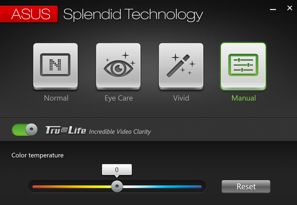 Откорректировать изображение можно программой от производителя — ASUS Splendid. В ней можно как самостоятельно подправить цветовую температуру, так и воспользоватся предустановленными режимами: Eye Care — снижает уровень синего цвета для комфортного использования в темноте и Vivid — в котором дисплей становится чуть ярче, а цвета более насыщенными.