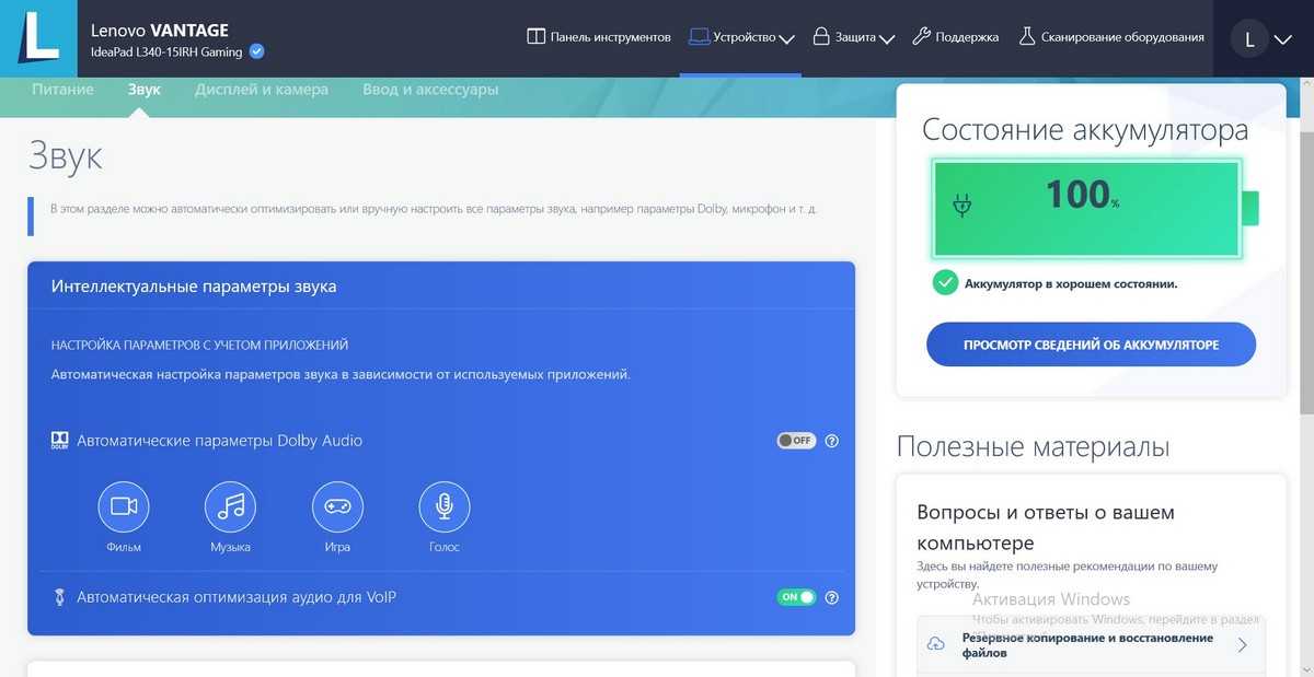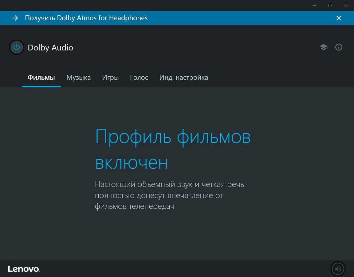 Есть предустановленная утилита Dolby Audio, в которой присутствует несколько предустановок звука: фильмы, музыка, игры, голос и настраиваемый десятиполосный эквалайзер. И эта программа действительно влияет на ситуацию. Появляется некий объем, громкость становится немного выше — в общем, рекомендую покопаться и выбрать подходящий пресет. Или заморочиться и настроить звук в эквалайзере основываясь на личных предпочтениях вручную. В проводных или беспроводных наушниках со звуком всё просто хорошо.