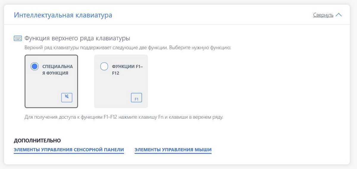 По умолчанию верхний ряд кнопок выполняет стандартную функцию F-клавиш, то есть чтобы управлять некоторыми функциями устройства, придется нажимать их одновременно с Fn. Однако можно настроить обратную логику и для этого не обязательно «ходить» в BIOS, достаточно выбрать желаемое поведение кнопок в фирменной утилите Lenovo Vantage.