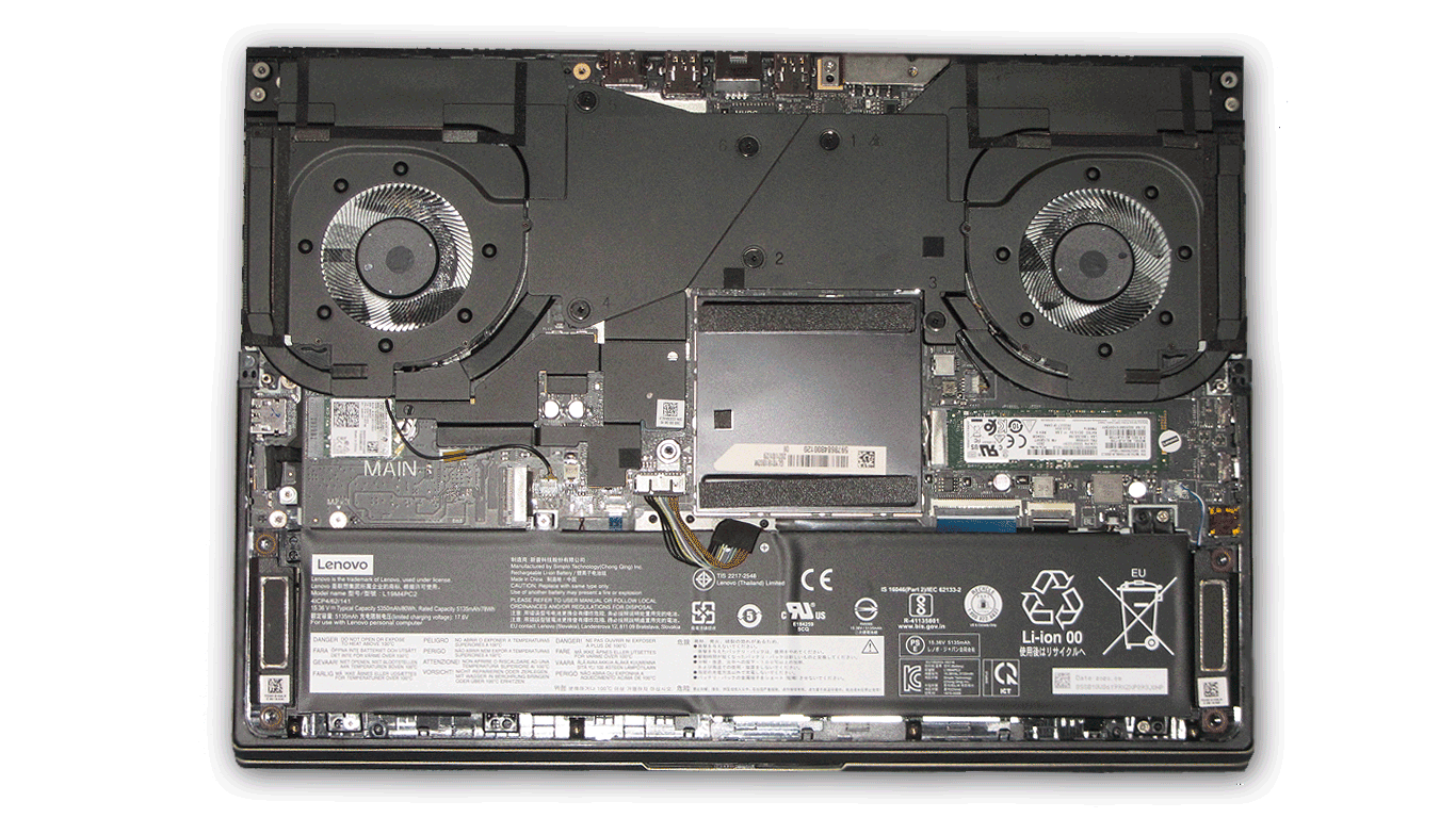 Петли теперь плотно фиксируют дисплей в удобном положении максимальный угол раскрытия составляет 180 градусов. Несмотря на то что корпус Lenovo Legion Y740 довольно тонкий, тут имеются практически все необходимые возможности для подключения. Ассортимент портов стандартный для 15.6-дюймового ноутбука: Правая сторона: кнопка Lenovo OneKey Recovery и порт USB 3.1 Gen 1. Слева: 3,5 мм комбинированный аудио порт, один USB ype-C Gen 2 / Thunderbolt 3,0, Сзади: Mini-DisplayPort, HDMI, USB 3.1 Gen 2 х 2, Gigabit Ethernet, порт зарядки, порт Kensington. Как видим большая часть портов расположена на задней стороне ноутбука, хорошо это или плохо решать Вам, кому -то такой подход кажется вполне удобным, кто-то наоборот скажет, что подключать внешнюю периферию неудобно. По разборке и обслуживанию все точно так же, как и у прошлогоднего Legion Y730. Заметных изменений во внутренней компоновке не произошло. Единственное, что бросается в глаза — система охлаждения теперь накрывает и чипсет (справа от экранированного блока с оперативной памятью).