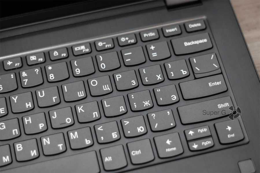 Клавиатура выполнена в классическом для Lenovo виде под названием AccuType. Компоновка клавиш неплотная, поэтому риск ошибочного нажатия невелик. Кнопки квадратные, внизу закругленные, маркировка белая. Не обошлось без подсветки, поэтому печатать можно в условиях плохого освещения или его отсутствия. Клавиши нажимаются без усилий, с негромким щелчком. У них средний ход и отличная отдача. Раскладка стандартная, не требует привыкания. Кнопка однорядная, обе – крупные, так же, как и , . Набирать текст удобно, руки не устают даже после целого рабочего дня. Еще один плюс – всегда прохладная рабочая зона. Единственный минус: это кнопки со стрелками «вверх» и «вниз»: их сделали какими-то чересчур узкими, так что порой вместо одной нажимаешь другую, а иногда — обе сразу. Гладкий тачпад крупного размера имеет четкие границы, поэтому его легко найти вслепую. Сенсорная панель имеет поддержку multi-touch, и это значит, что мышка вам может и не пригодиться. Двумя пальцами можно прокручивать страницы вверх и вниз, тремя — открывать окошко запущенных программ. Правее от тачпада расположен сканер отпечатка пальца, который защищает данные на устройстве от посторонних глаз.