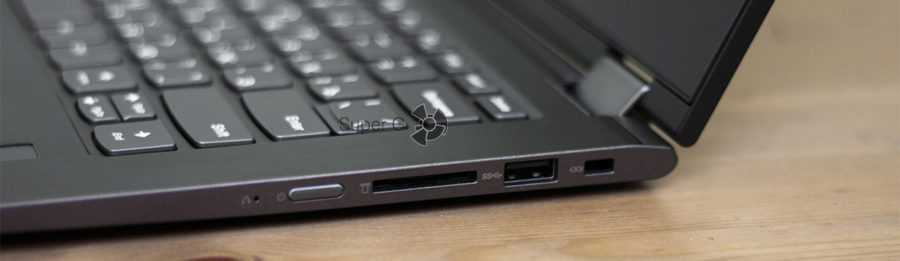 На левой грани корпуса расположилось круглое гнездо зарядки, аудиоразъём, HDMI, а также по порту каждого вида: USB-C и USB 3.0. На правой стороне мы видим ещё один USB 3.0, замок Kensington Lock и карт-ридер. Всё, больше никаких гнёзд на ноуте нет. Кстати, справа также красуется кнопка питания с подсветкой. И у неё жутко неудобное расположение.