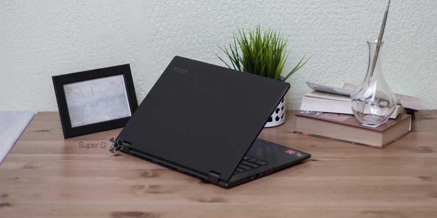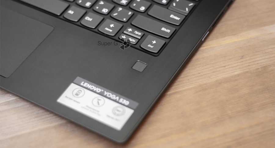 Когда Yoga 530 стоит на столе не полностью сложенным, ещё нормально. Но когда юзаешь его как планшет и держишь в руках, нащупывать квадратик сканера на тыльной стороне вообще неудобно — опять же, из-за габаритов корпуса.