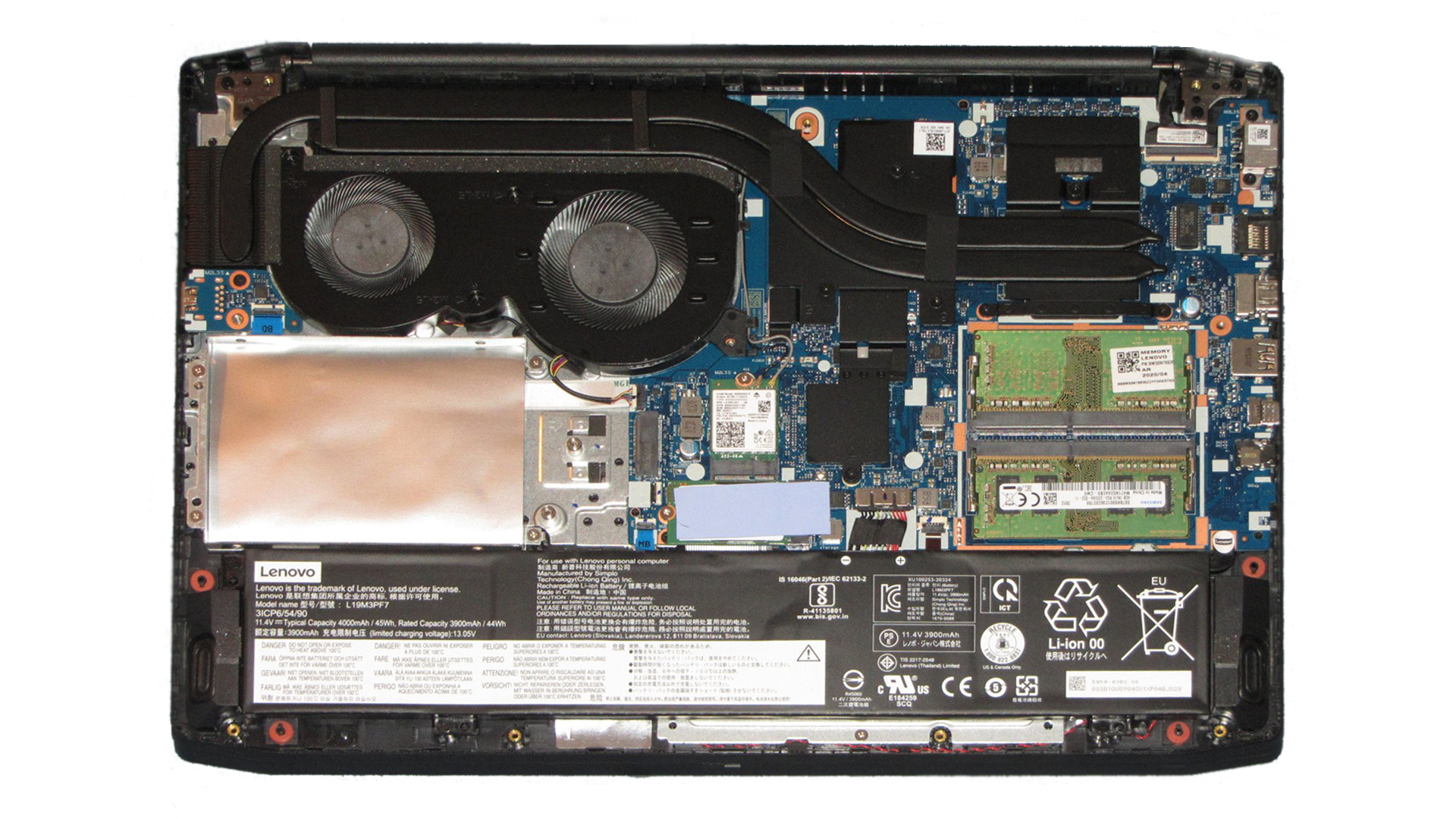В Lenovo IdeaPad Gaming 3 15IMH05 также нет крышки для быстрого доступа к компонентам. Чтобы добраться до начинки придется снимать нижнюю крышку. Для этого нужно просто выкрутить все болты и поддеть ее чем-нибудь острым. После снятия крышки, получаем доступ к жесткому диску, кулерам, модулю WLAN, оперативной памяти и батарее.