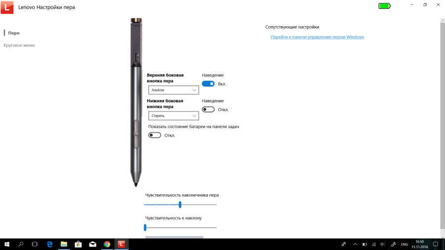 В комплекте с моей моделью Yoga 530 шёл Active Pen первого поколения. Разница со вторым поколением в цвете (у меня — чёрный, второе поколение — серый) и в том, что Pen 2 умеет заряжаться от провода USB, а первая «активная ручка» работает только от батарейки типа АААА. Я даже слегка удивился, когда обнаружил. Стилус на батарейках — это забавно.