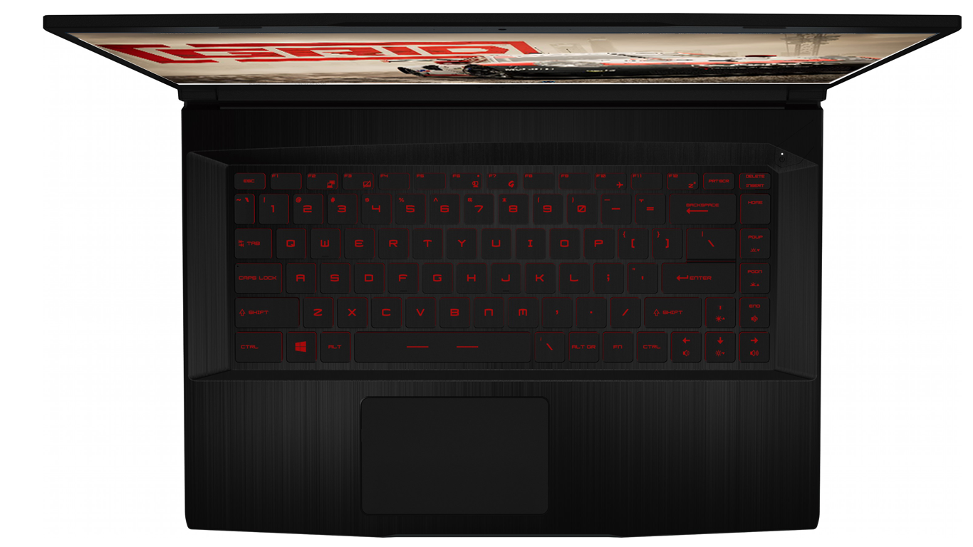 Клавиатура SteelSeries выполнена полноразмерной, просторной, с оптимальным расстоянием между клавишами, размер основных кнопок составляет 15 × 15 мм, расстояние между ними 3,5 мм, чего вполне достаточно, чтобы не промахиваться мимо нужной клавиши. Клавиши обладают четкой обратной связью и коротким ходом, нажимаются довольно мягко. В целом клавиатура абсолютно аналогична той, что установлена в GF62. Клавиши подсвечиваются красным, что добавляет комфорта в темное время суток. Кнопка включения питания расположена в правом верхнем углу рабочей поверхности. Рядом с ней есть еще две кнопки: Cooler Boost, нажатие на которую позволяет увеличить до максимума скорость вращения вентиляторов системы охлаждения, и SteelSeries Engine, управляющая подсветкой клавиатуры.