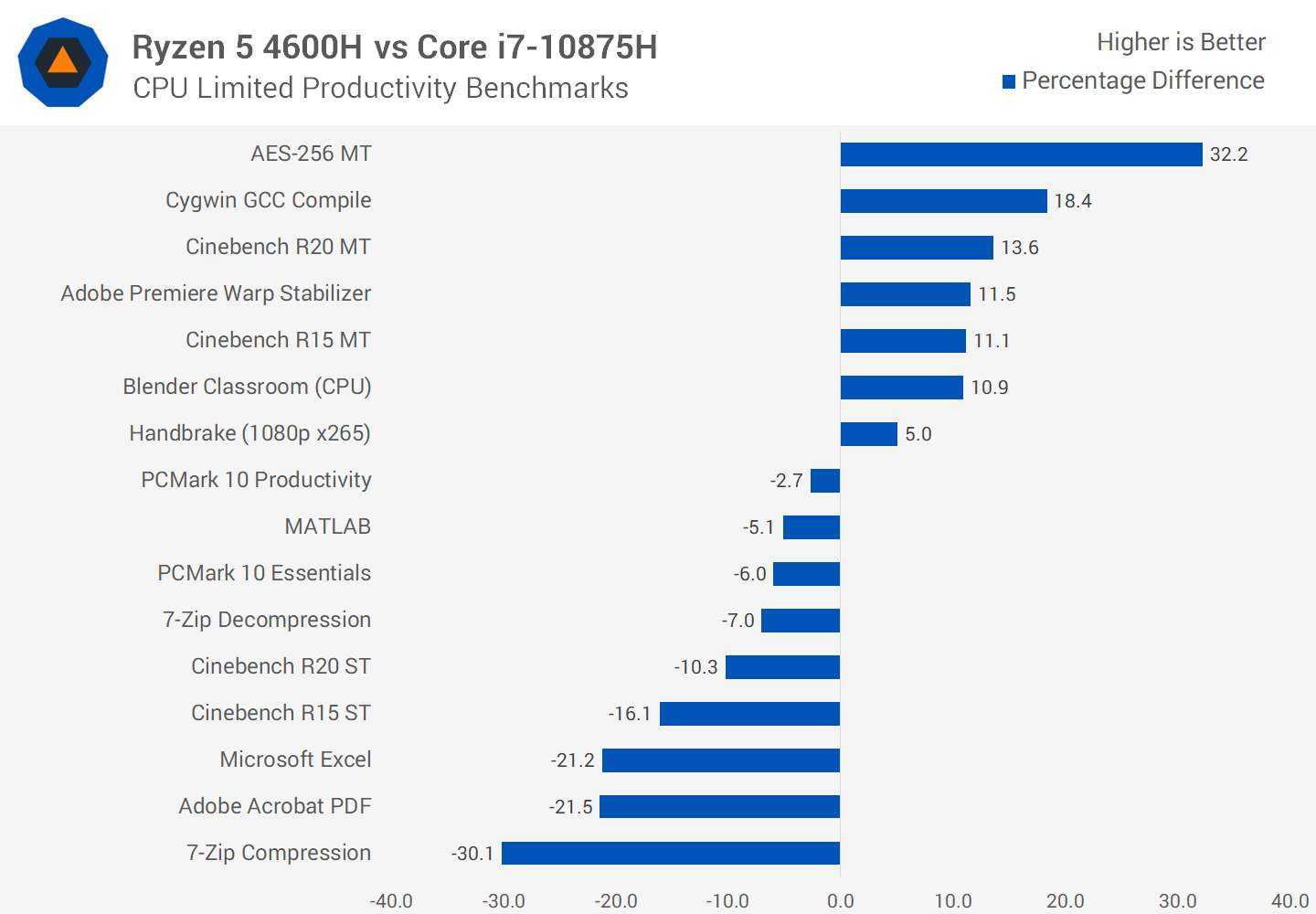 Ryzen 5 4600H не уступает восьмиядерному Core i7-10875H в многоядерных тестах. Фактически, Ryzen 5 4600H может быть на 10 процентов быстрее. Однако с превосходной однопоточной производительностью и более высокими тактовыми частотами существует множество рабочих нагрузок, в которых Ryzen 5 4600H не быстрее.