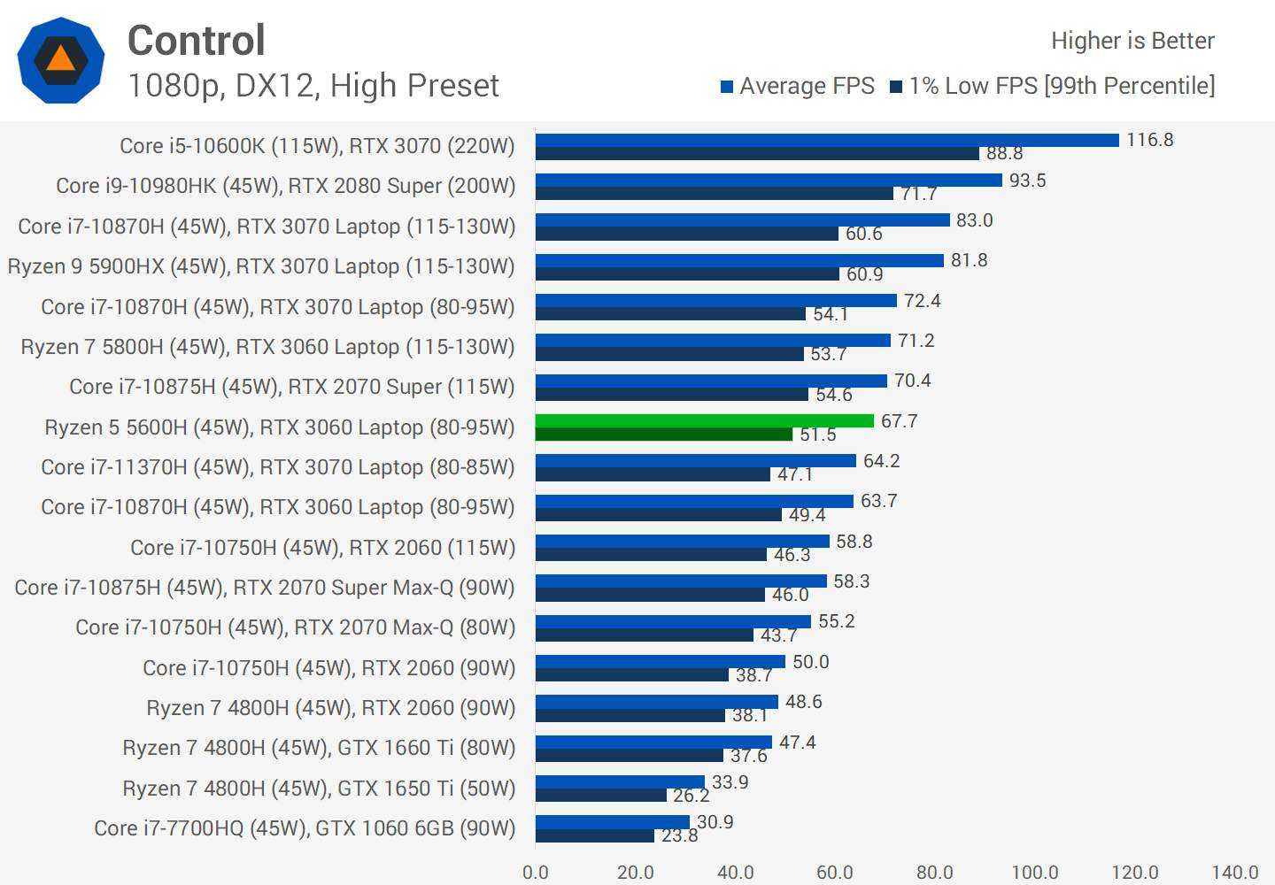 Третий сценарий — это ряд ситуаций, когда Ryzen 5 5600H был быстрее, чем Core i7-10870H с тем же графическим процессором RTX 3060. Иногда, как в Control, кажется, что эффективность 5600H зависит от Nvidia Dynamic Boost, что позволяет RTX 3060 чаще достигать потолка 95 Вт в этой конфигурации, когда процессор Ryzen работает с пониженной мощностью. Для сравнения, 10870H не так способен снижать уровни мощности без потери производительности, поэтому графический процессор потребляет около 85 Вт.