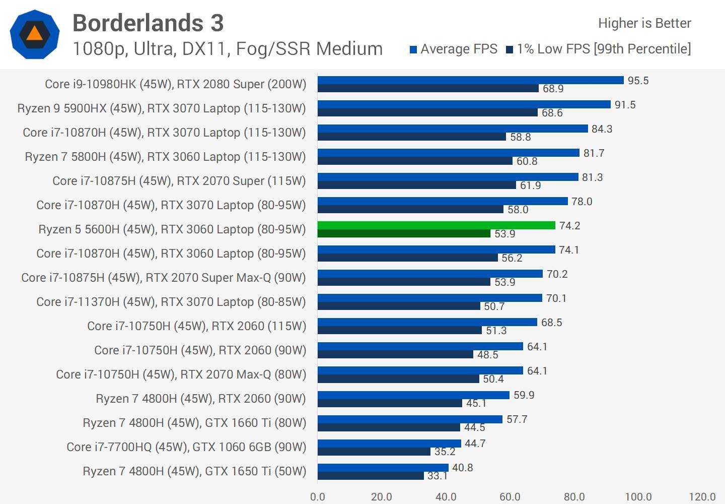 Другой пример — Borderlands 3, название, которое мы обычно связываем с требованием к процессору, но Ryzen 5 5600H не уступает Core i7-10870H, когда обе системы настроены с одним и тем же графическим процессором. Так что это многообещающий результат, учитывая, что ноутбуки Ryzen 5 обычно дешевле ноутбуков с Core i7, особенно с 10870H внутри.