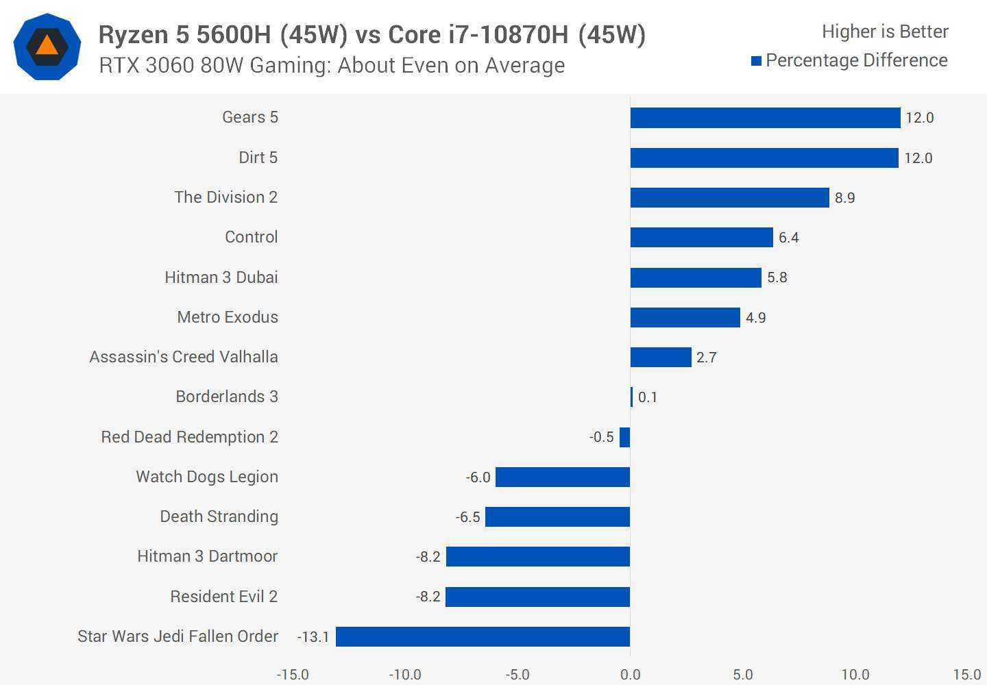 Во-первых, в играх с ограниченным ЦП Ryzen 5 5600H работает нормально, но не удивительно. Например, в тесте Hitman 3 Dartmoor 5600H с RTX 3060 немного быстрее, чем система 4800H последнего поколения с RTX 2060, и примерно на 8 процентов медленнее, чем конфигурация Core i7-10870H.