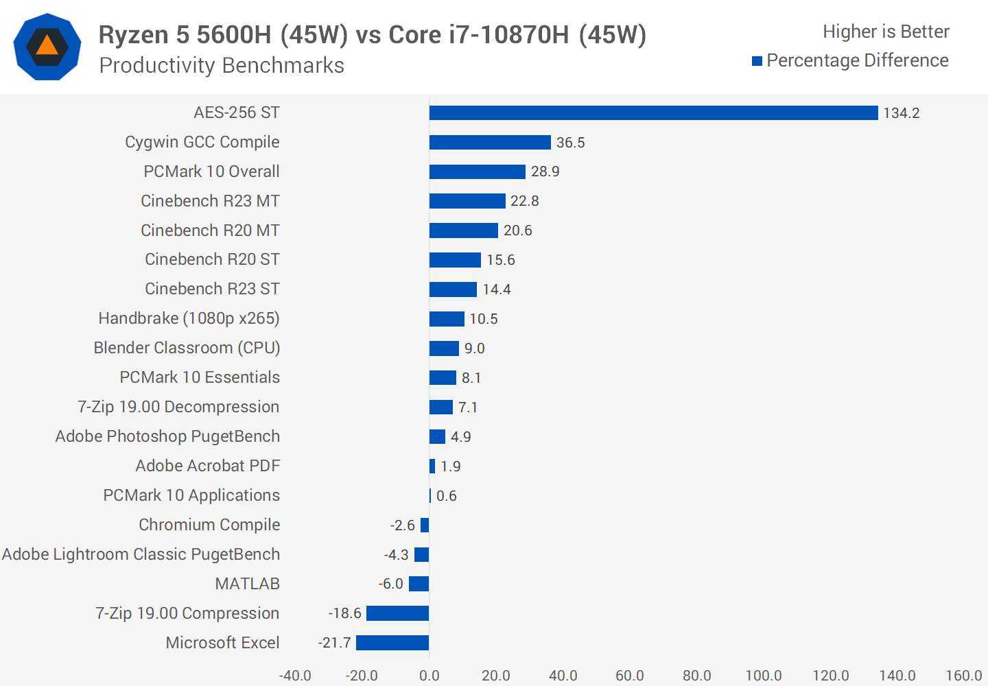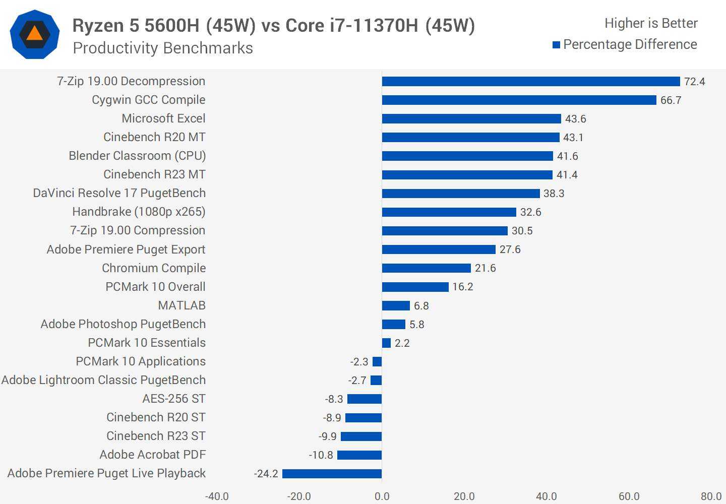 По сравнению со своим прямым предшественником, Ryzen 5 4600H, 5600H примерно на 10-15 процентов быстрее в многопоточных рабочих нагрузках и более чем на 20% быстрее в однопоточных тестах, что является респектабельным для процессоров массового ноутбука.