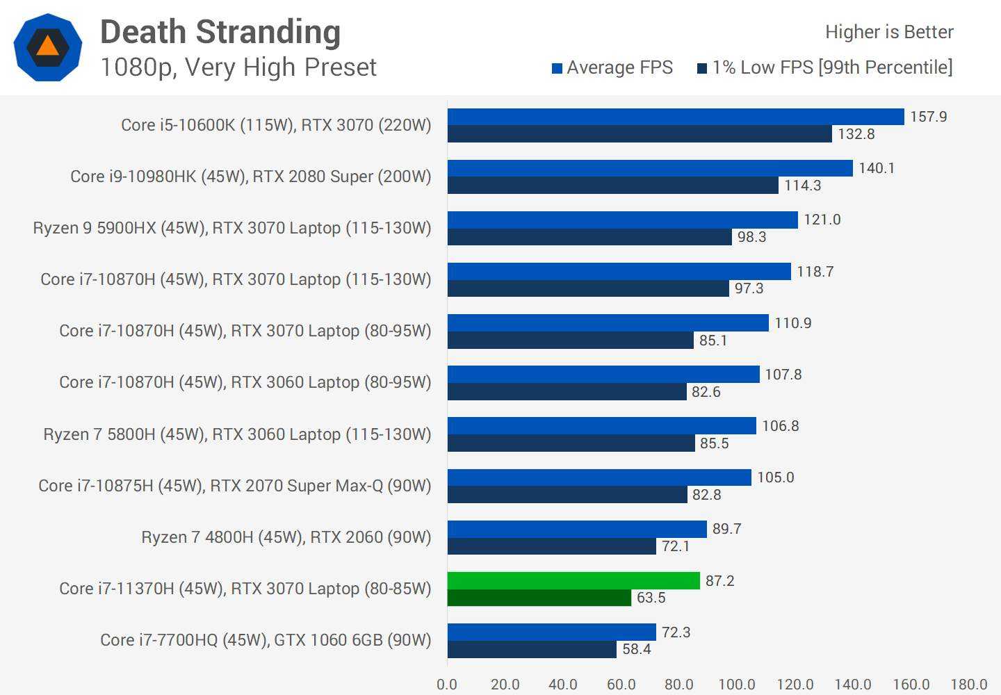 И последняя диаграмма, которую я здесь покажу, — это Death Stranding, где снова система 11370H сильно ограничена в процессоре. Конфигурация 10870H была на 36% быстрее, поскольку четырехъядерный процессор является существенным ограничивающим фактором производительности при воспроизведении с разрешением 1080p. Учитывая, что работа с разрешением 1080p с включенным Optimus является стандартной настройкой по умолчанию, это не очень хорошо.