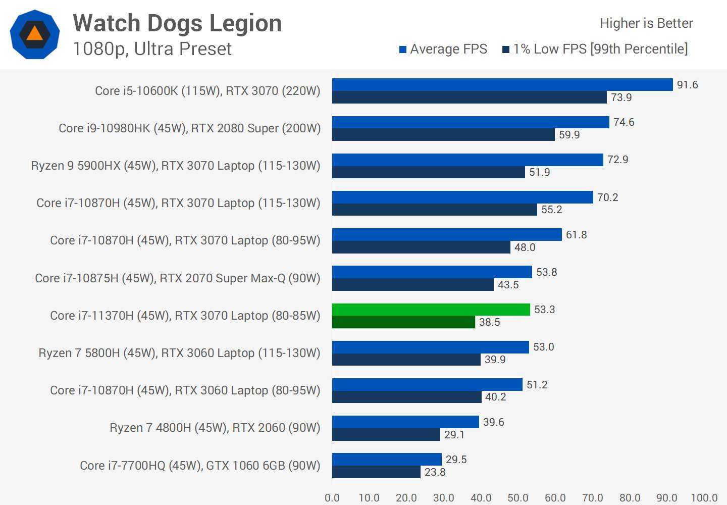 Здесь мы покажем еще пару тестов, один из них — Watch Dogs Legion. Мы снова видим несоответствие в производительности между новым четырехъядерным дизайном и старым восьмиъядерным дизайном, при этом 10870H в этой игре опережает на 16%. Здесь снова все протестировано с включенным Оптимусом в конфигурации «яблоки к яблокам», вы получите больше производительности, если отключите Оптимус и позволите дисплею работать прямо от dGPU, так как это несколько уменьшит узкое место ЦП, однако другие системы увеличивают производительность по мере того, как хорошо с прямыми подключениями dGPU, и наша цель здесь — протестировать в среде с максимальным ограничением ЦП, насколько это возможно, как мы делаем со всеми обзорами ЦП.