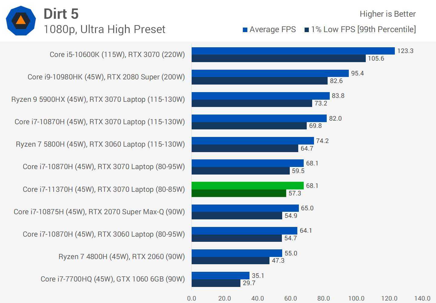 Далее у нас есть игровые тесты. Здесь лучше всего сравнивать Core i7-11370H и Core i7-10870H с одним и тем же графическим процессором RTX 3070 80 Вт. Оба этих процессора используются в этой первой волне обновленных игровых ноутбуков серии RTX 30, поэтому мы сразу же рассмотрим, как они складываются.