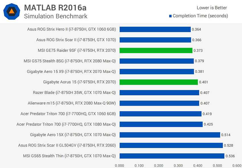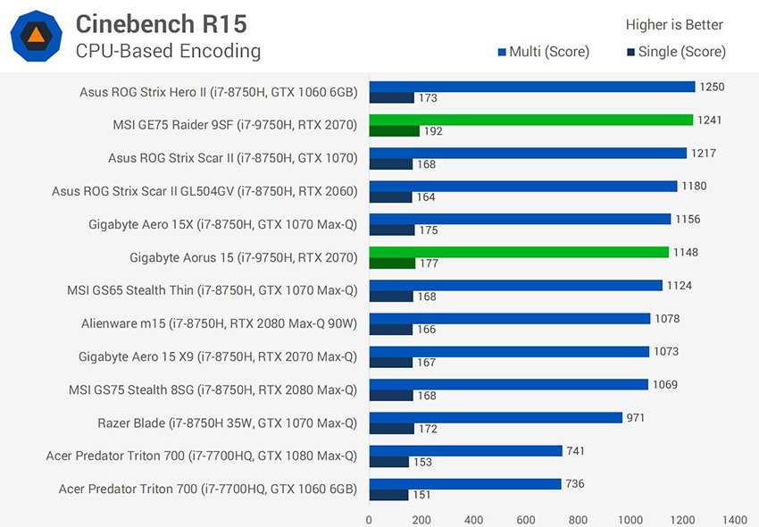 Вот еще один результат Cinebench R15, с расширенным составом участников. Модель MSI показывает хороший результат в многопоточном режиме, но это не самый быстрый ноутбук – первое место занимает ноутбук Asus с процессором i7-8750H. Ноутбук Gigabyte оказывается в середине турнирной таблицы: он не самый медленный, но и ничего выдающегося не показывает.