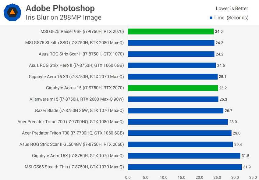 Этот результат по сути мало отличается от предыдущих: в Adobe Photoshop эффект Iris Blur, зависящий главным образом от производительности CPU, показывает процессор 9750H с лучшей стороны, но явного преимущества перед 8750H здесь нет.