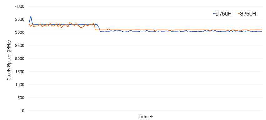 И вот что мы фактически имеем в части тактовых частот (в многопоточном режиме). В Cinebench R20 процессор Core i7-8750H в составе ноутбука Gigabyte Aero 15 X9 после бодрого начала спустился с уровня 3.3 ГГц на уровень 3.1 ГГц и с этой скоростью работал в течение длительного времени. И практически такое же поведение продемонстрировал новый процессор Core i7-9750H в составе Gigabyte Aorus 15. То есть по существу процессоры вели себя одинаково.
