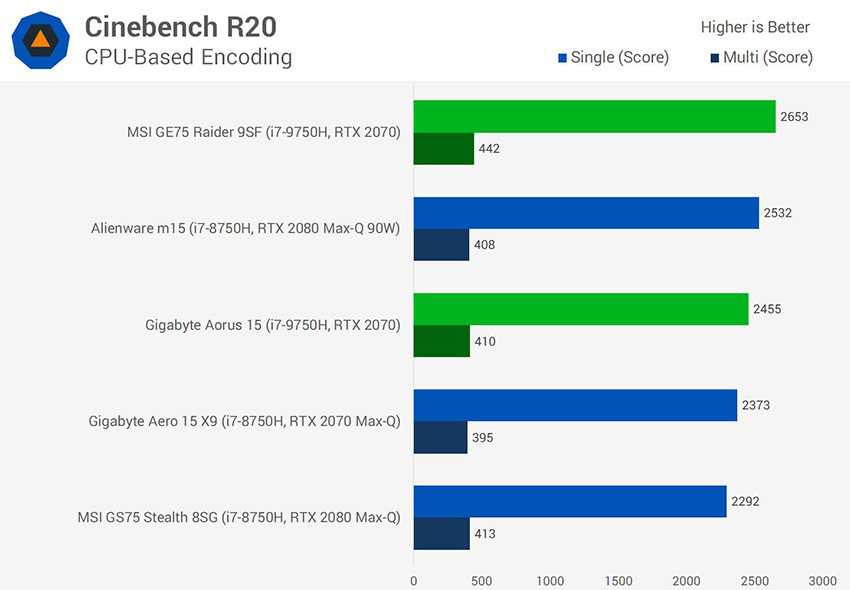 Однопоточный режим для модели MSI более предпочтителен: здесь она была на 13% быстрее ноутбука с Core i7-8750H. В этом режиме проявляются те самые «одноядерные» характеристики, которые указаны в спецификации.