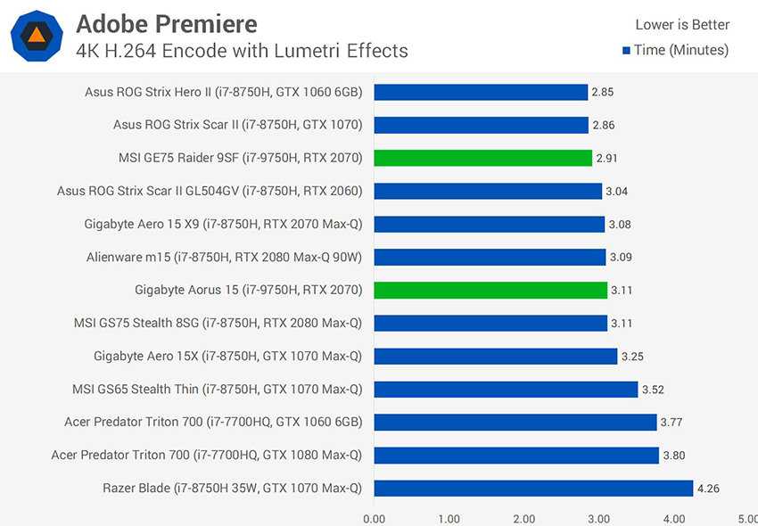 Бенчмарк Premiere с эффектами Lumetri, хотя и задействует в должной мере графический процессор, выявляет и ограничения со стороны CPU, которые становятся определяющими, когда вы используете видеокарту, например, уровня GTX 1060. И снова мы видим, что ноутбук MSI здесь не самый быстрый, но попадает в первую тройку, а ноутбук Gigabyte по скорости практически не отличается от большинства моделей с процессором Core i7-8750H.