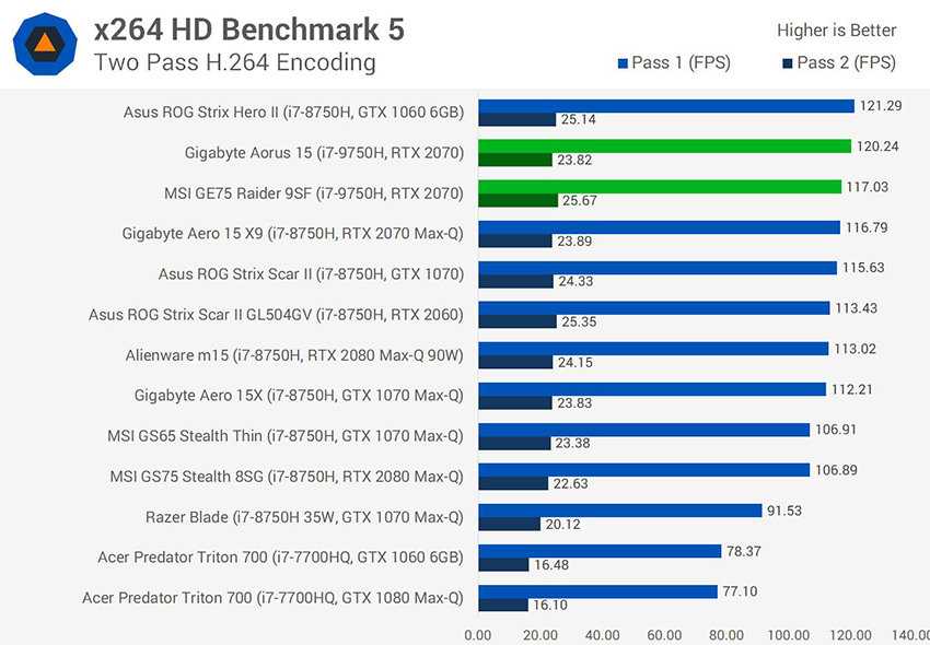 В тесте с кодеком H.264 ноутбуки с процессором Core i7-9750H в первом прогоне показали хорошие результаты, но во втором прогоне ноутбук Gigabyte немного провалился. Ноутбук MSI во втором прогоне был абсолютно лучшим, но он лишь слегка (где-то на один процент) опередил модель Asus, занявшую по результатам двух прогонов первое место. Не самый убедительный повод для апгрейда.