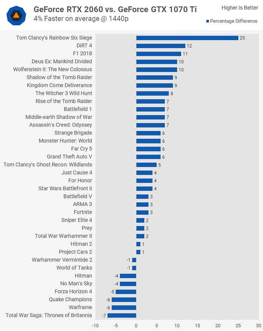 Непосредственное сравнение результатов видеокарт RTX 2060 и RTX 2070 показывает, что в худшем случае RTX 2060 оказывается на 16% медленнее. В то же время в ряде игр разница составляет менее 10%, и общий вывод таков: на разрешении 1440p карта RTX 2060 в среднем всего на 11% медленнее RTX 2070. Удивительно, зачем платить на 30% больше за видеокарту, которая даже не на 15% быстрее.