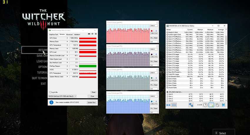 По сравнению с «обычной» GTX 1650 версия Max-Q, которая используется в ноутбуке GF63 9SC, справляется с нагрузкой, работая на более низких тактовых частотах. Ее номинальная базовая частота составляет 1020 МГц вместо 1395 МГц. На практике чип GPU выходит на более высокие частоты благодаря технологии Boost (аналог технологии Intel Turbo Boost для CPU). В тесте Unigine Heaven видеокарта ноутбука GF63 вышла на частоту 1440 МГц, а в 60-минутном тесте «The Witcher 3» выдавала очень стабильную частоту кадров на частоте GPU 1400 МГц. Это также косвенно указывает на высокую эффективность системы охлаждения.