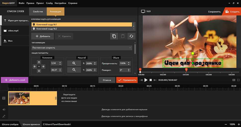 Если вы хотите создать собственный тип анимации или написать текст на видео на конкретном временном отрезке, воспользуйтесь ручной настройкой. Для этого перейдите в режим редактирования слайда и добавьте слой с обычной надписью. Затем откройте вкладку «Анимация». Там вы сможете самостоятельно регулировать перемещение текста по видео и его внешние свойства, фиксируя каждое изменение с помощью ключевых точек.