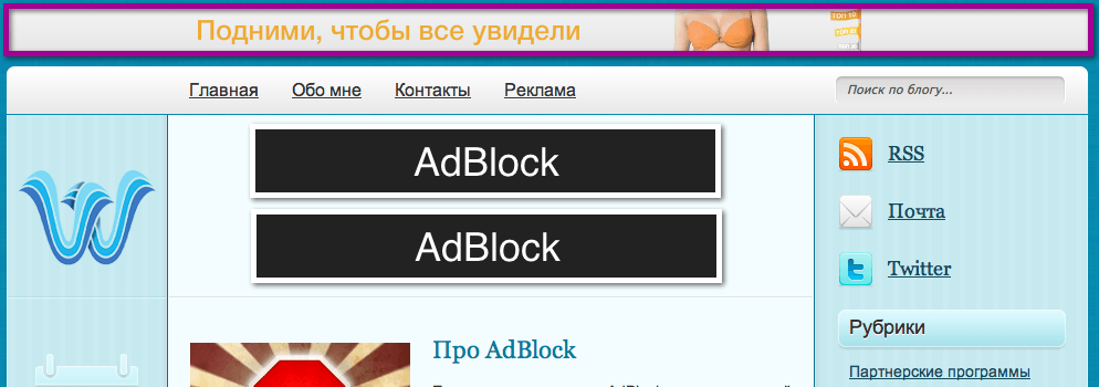 Как видите, adblock не смог заблокировать и эту рекламу. Я не знаю почему adblock не блокирует эту рекламу, может они проплатили разработчику? А может у них хитрый скрипт? А может adblock пока их не вычислил? Я не знаю. Более развернутое исследование по этому вопросу я как то .