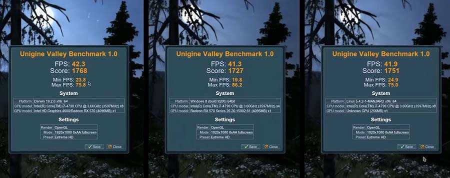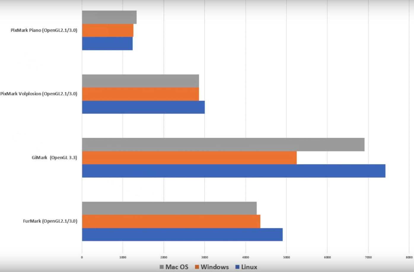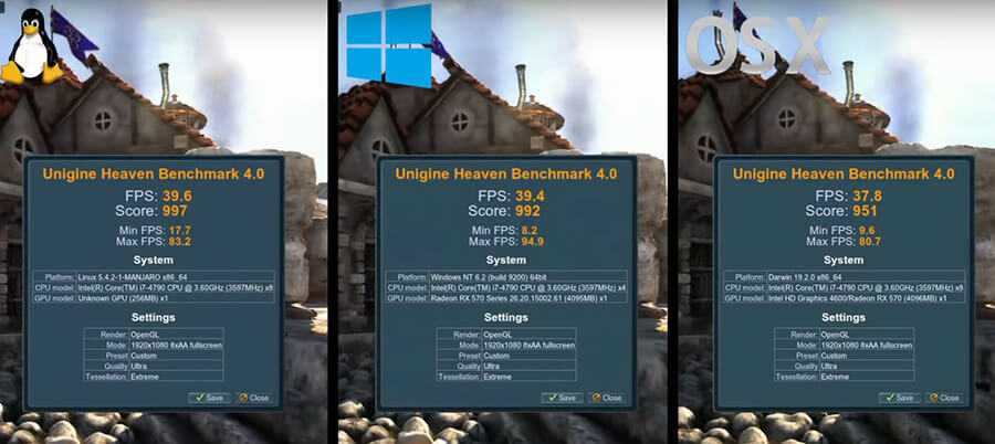 Benchmark Heavane здесь если прогнать тест в OpenGL то результат windows и linux паритетный mac os здесь отстает на 5 процентов.