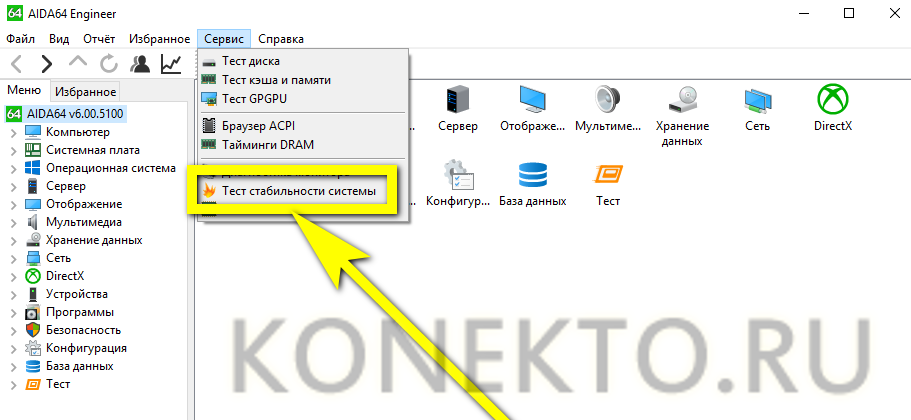 Скачать (ссылка — aida64russia.com) и запустить приложение, открыть выпадающее меню «Сервис».