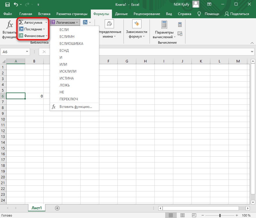 В Excel есть отдельная вкладка, где расположена вся библиотека формул. Вы можете использовать ее для быстрого поиска и вставки необходимой функции, а для редактирования откроется то же самое окно, о котором шла речь выше. Просто перейдите на вкладку с соответствующим названием и откройте одну из категорий для выбора функции.