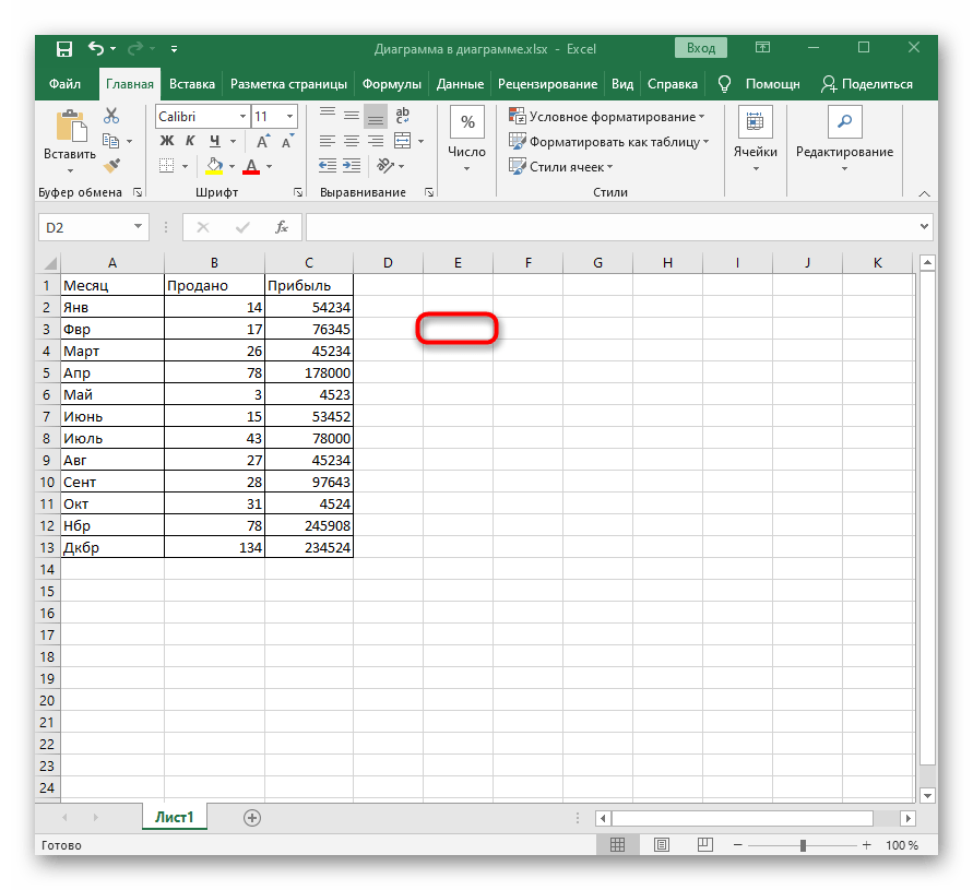 Выберите нужную ячейку, нажав на нее левой кнопкой мыши. В нашем случае это ячейка B2, где «B» означает второй столбец, а «2» – вторую строку листа. Нажимаем на ячейку B2 левой кнопкой мыши