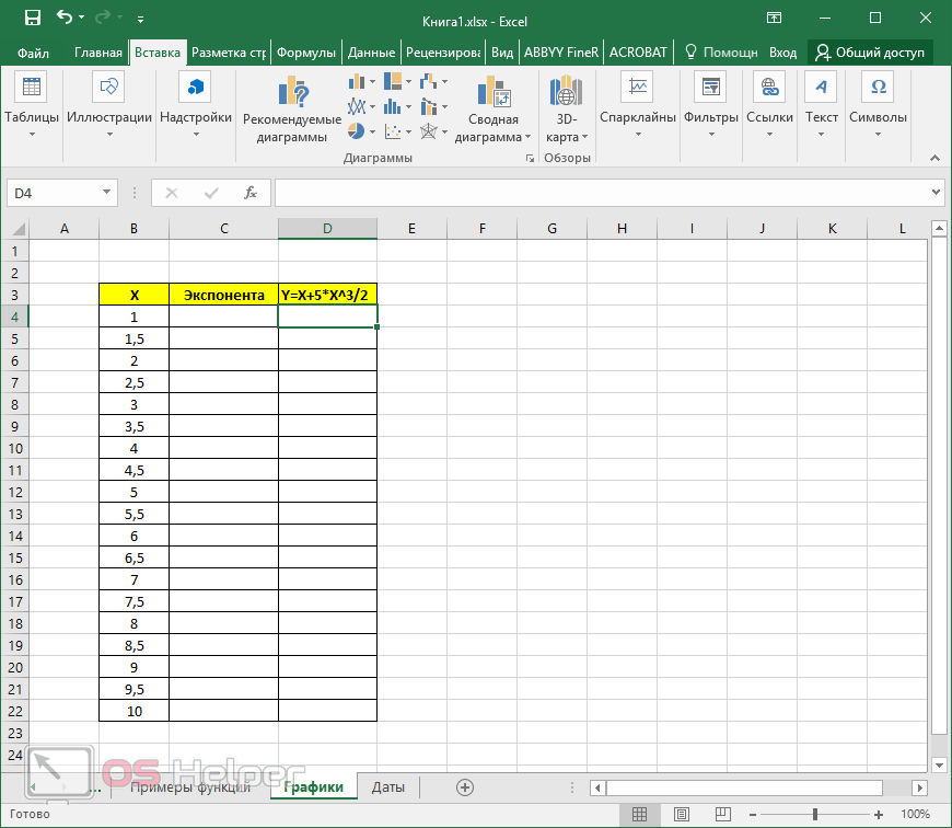 В качестве примера попробуем построить графики для экспоненты и какого-нибудь уравнения. Инструкция будет следующей:
