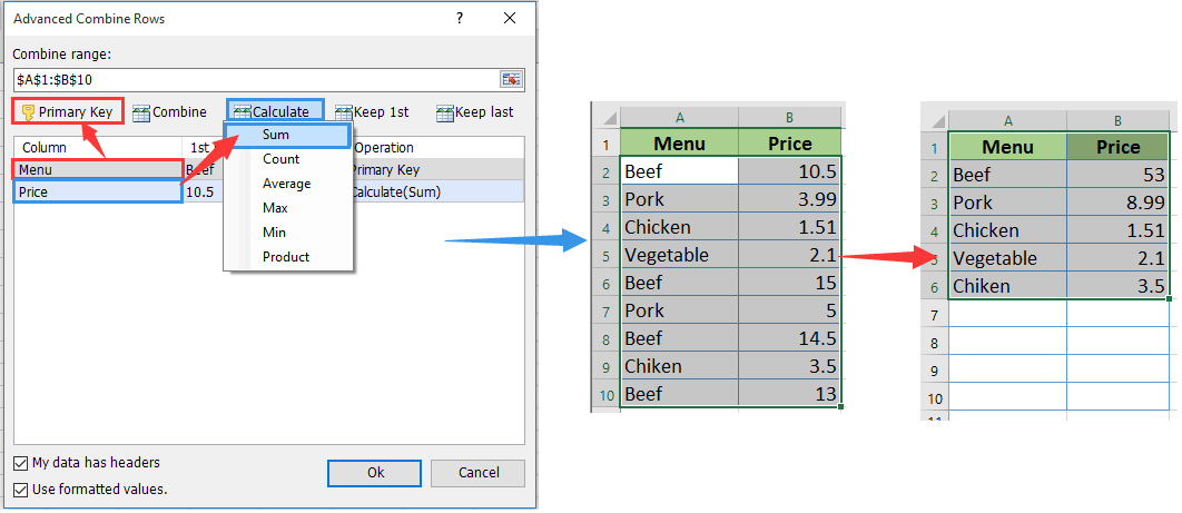 Освободи Себя Kutools for Excel’s Расширенные ряды комбинирования утилита поможет вам легко объединить повторяющиеся строки в столбце и вычислить или объединить значения в другом столбце на основе дубликатов в ExcelСкачайте и попробуйте прямо сейчас! (30-дневная бесплатная трасса)